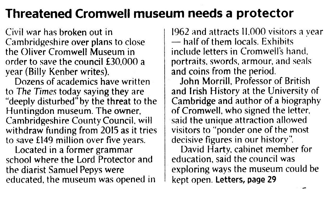 It’s also right that we are “very committed to supporting an independent Cromwell Museum” (p 18) but this latter view is only because we were faced with the fact that the County Council has made its decision to, eventually, cease its funding. It must be remembered that the ‘Save the Cromwell Museum’ campaign, steered by the Friends, led to nearly 4000 signatures calling on the County Council to reverse this decision and provide funding for at least five years. Their deferral by a year was welcome as being preferable to their original proposal to withdraw funding at the end of March 2015 but not the full outcome sought.